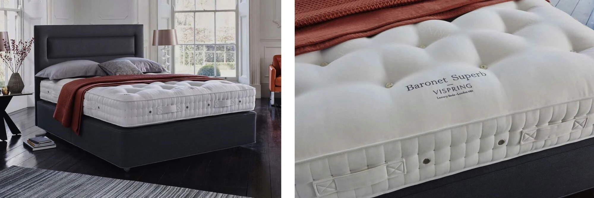 The Baronet Superb divan bed is the second option in our range of Vispring mattresses. This slightly firmer feeling mattress provides you with restful sleep night after night, and with an added layer of extra-durable horsehair you'll find it more substantial than the Elite mattress before it. This mattress has been designed to rest perfectly on the Vispring Deluxe pocket-sprung divan base.