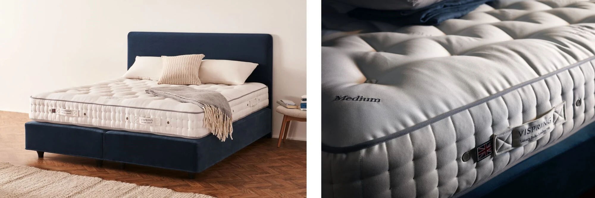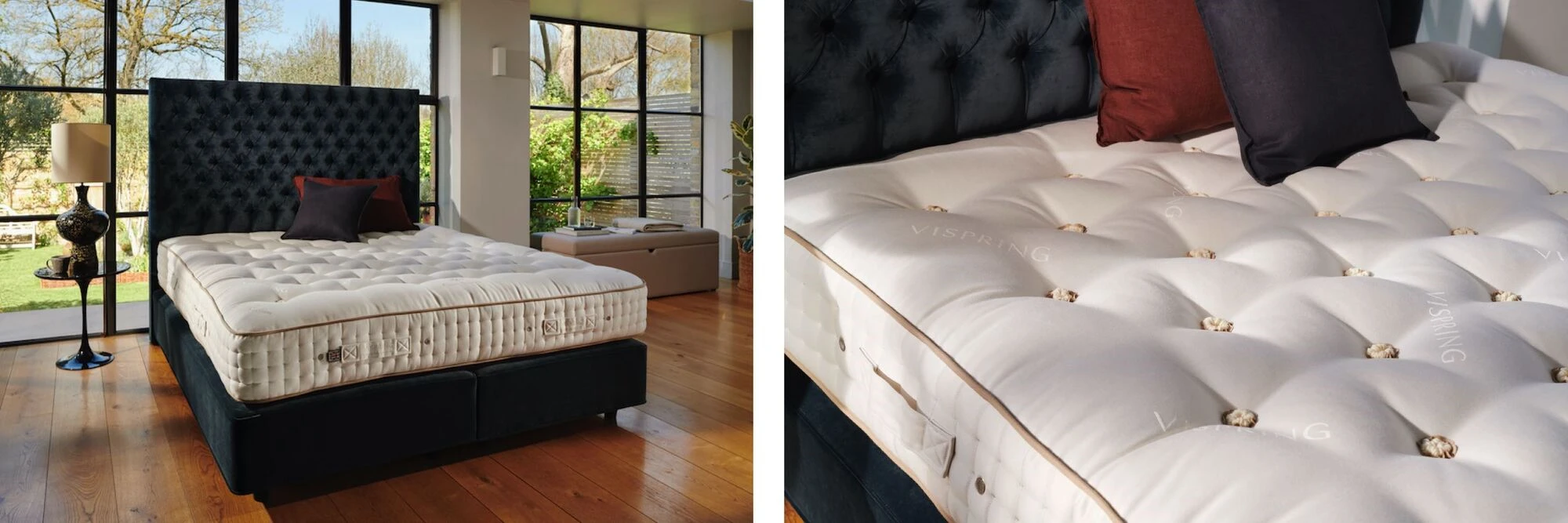 To start, Vispring have created a truly wonderful mattress and divan base combination. There is a perfect match of quality timber base with individually coiled vanadium steel pocket springs, with hand-crafted and hand-teased natural fillings in the mattress collection. These work together to respond to the contours of our body in a way that pocket-spring mattresses and mass-produced quilted fillings in other beds don't.