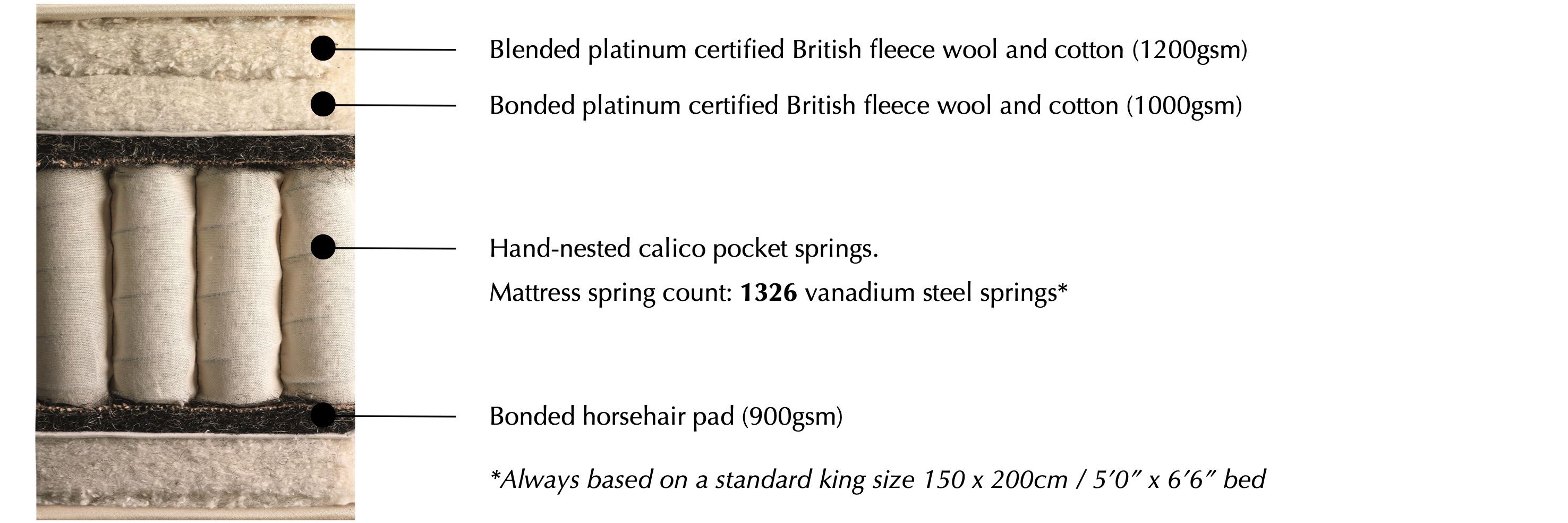 The Tiara Superb is hand-made to order by the best craftsmen in the industry and their time-honoured skills have been perfected to create this quality bed that is unrivalled by any other. The finest all natural fillings sourced from around the World include Platinum real Shetland wool, cotton and hand-teased South American horsetail. Copious amounts of upholstery is hand-teased and layered around hand-nested vanadium steel pocket springs set with two layers for exceptional responsiveness, comfort and ongoing support, increasing this mattress' longevity.