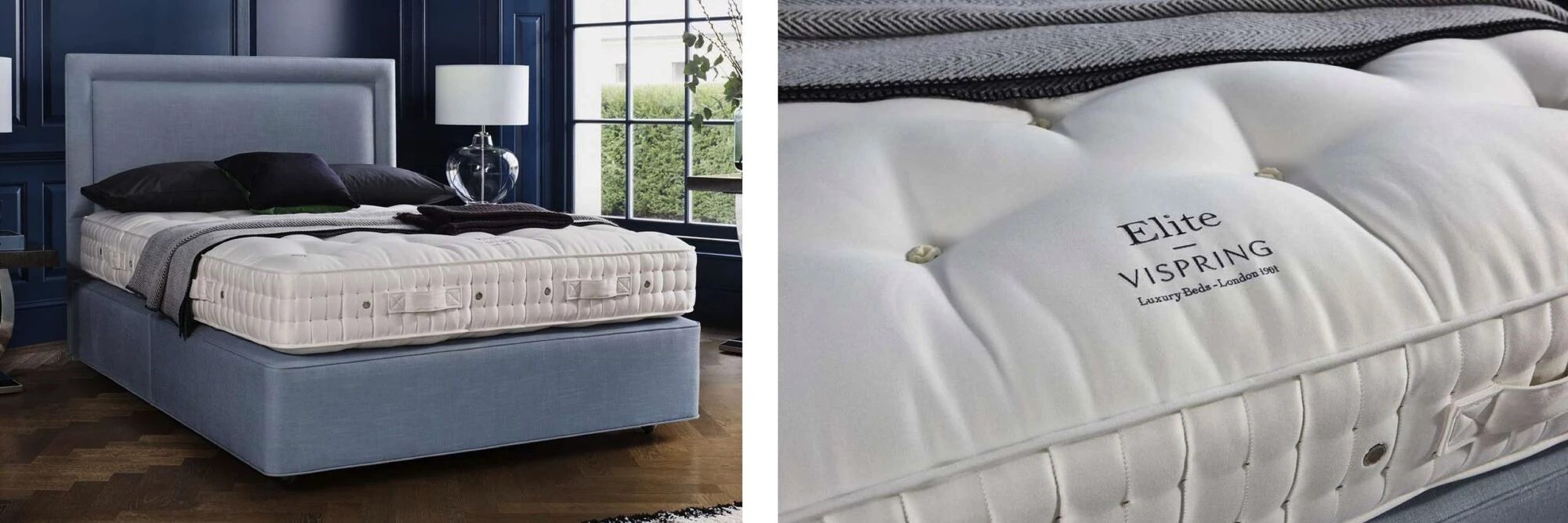 The Elite divan bed is where it begins in the Vispring mattress range With some very impressive levels of upholstery and the super quality of materials used, this mattress really shines over and above other similar-priced options. This mattress has been designed to rest perfectly on the Vispring De Luxe pocket sprung divan base.