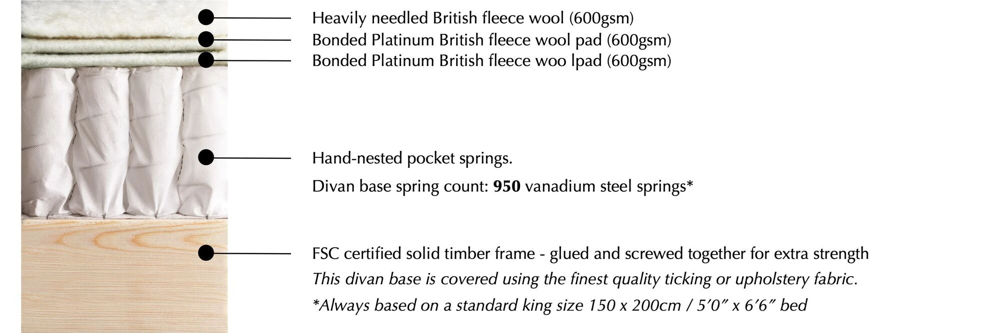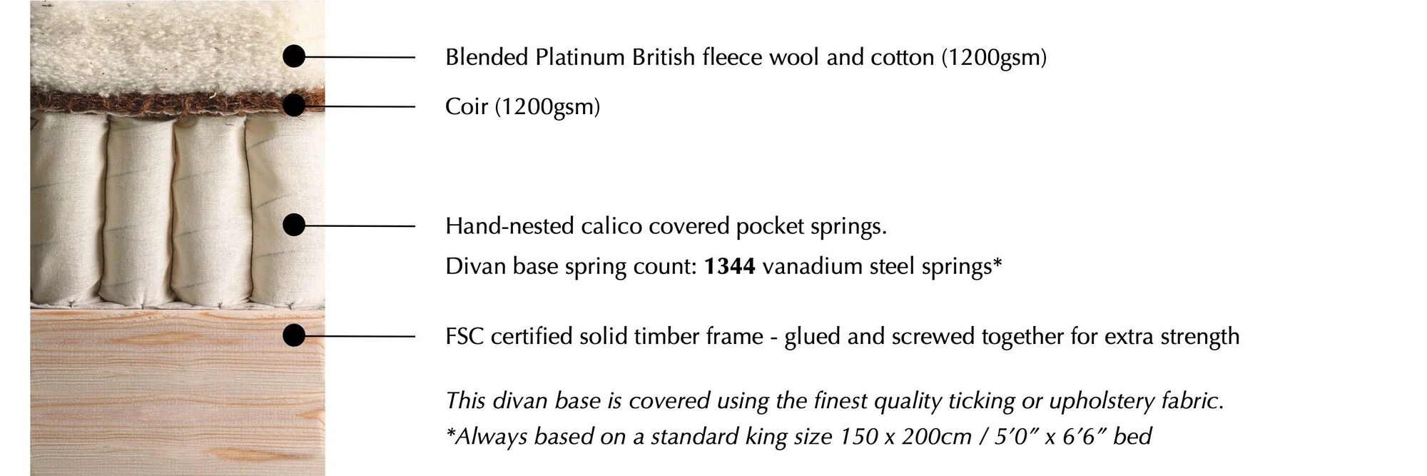 The Dartington divan bed is a fantastic upgrade to the Devonshire mattress. The fifth in our collection of world class hand-made British mattresses. A pure-wool mattress is simply one of the best for sleeping on as it's super breathable, cosy, durable and helps wick away excess body moisture, ideal for those that suffer from excess body heat during the night. Too much warmth can cause restless sleeping and wool regulates our body temperature like nothing else. The wool and cotton fleece are hand-teased to create a supportive, softer feel. The Dartington mattress has been designed to rest perfectly on the Vispring Prestige pocket sprung divan base.
