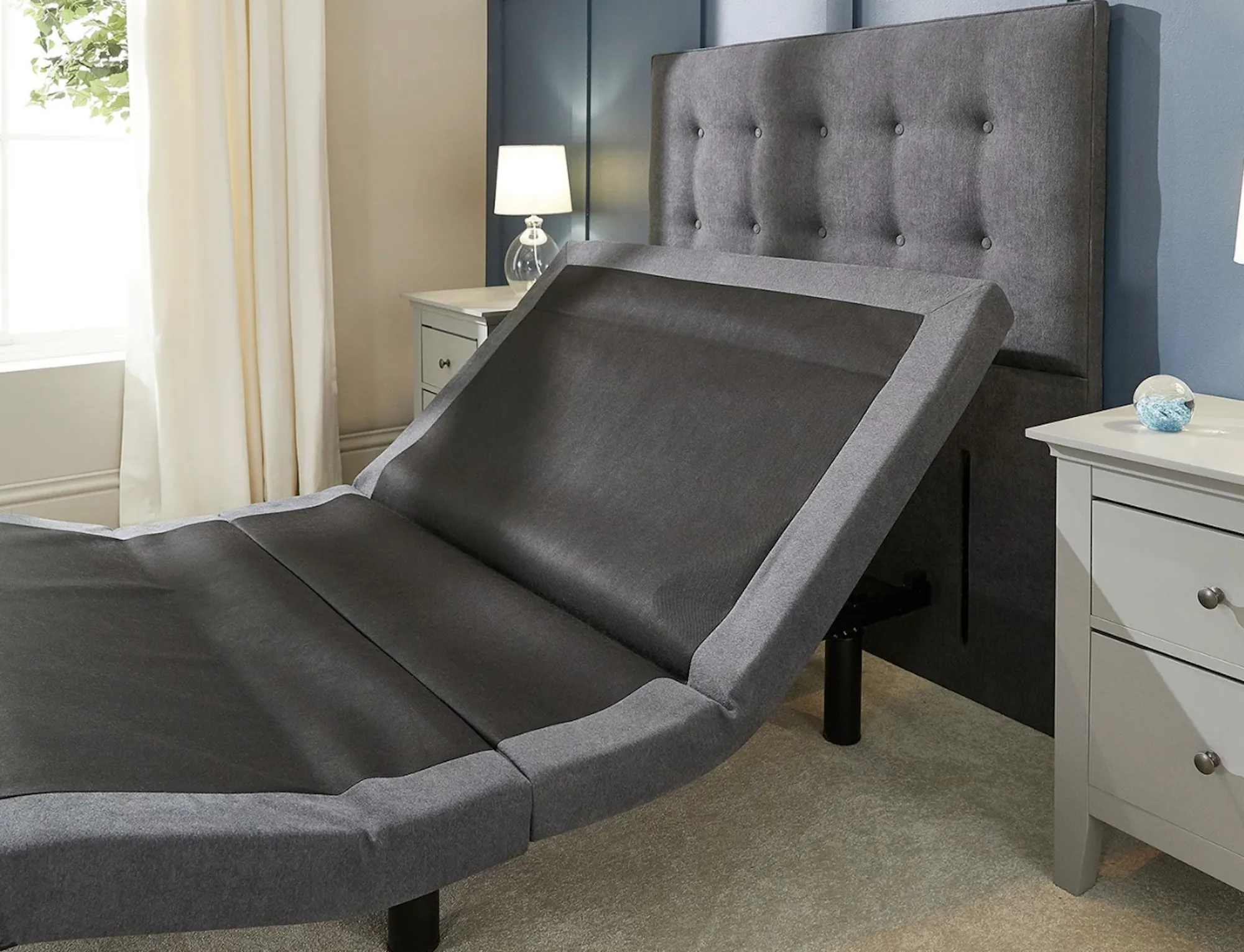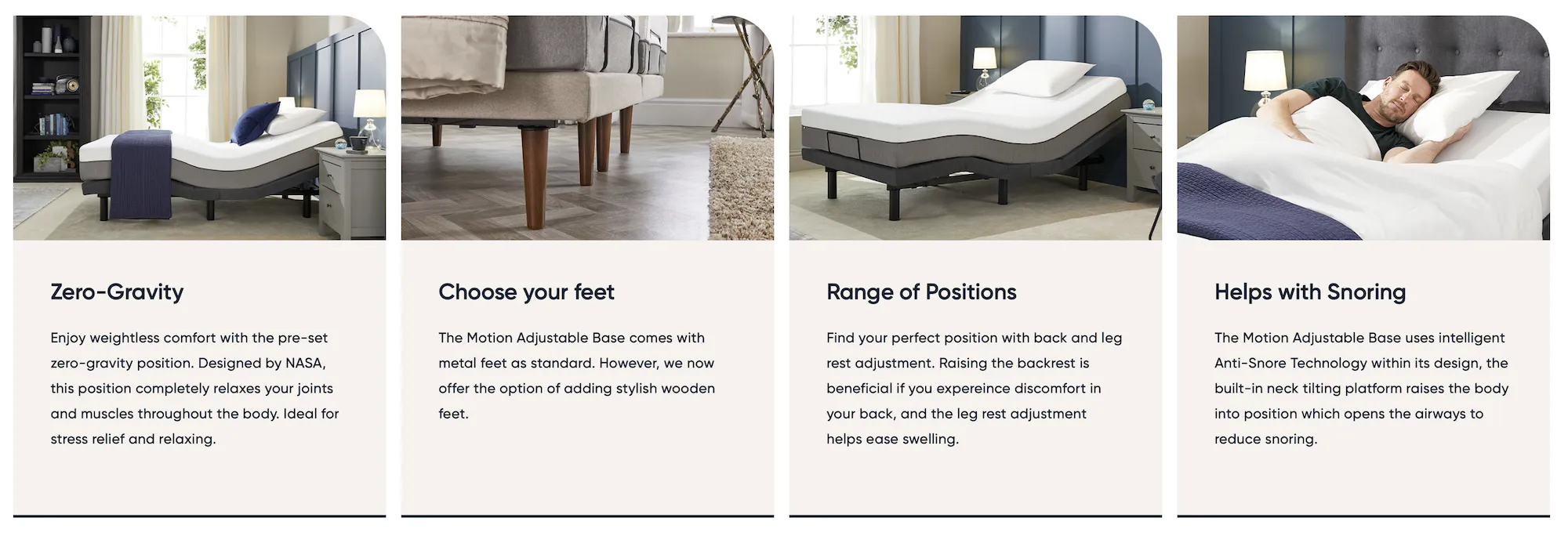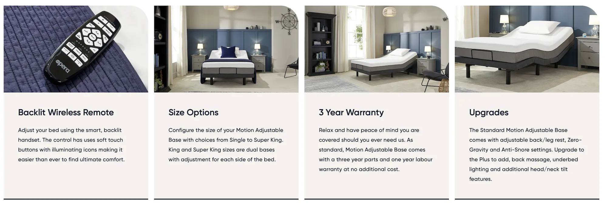 The motion adjustable base uses intelligent anti-snore technology within the design of the frame with a pre-set position for the back rest. The base gently reises the body into a position which opens the airways to reduce snoring.