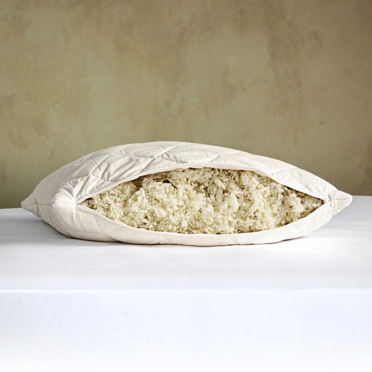 The Chatsworth Washable Wool Pillow .....It is impossible to make a washable wool pillow without using some form of treatment on the fibre. Wool Room have perfected a technique for removing the tiny barbs on the wool fibres that cause the material to shrink, clump and ultimately felt when washed. What you're left with is a 100% natural pillow that that is designed to help you sleep better for longer by managing heat and moisture and reducing humidity throughout the night.