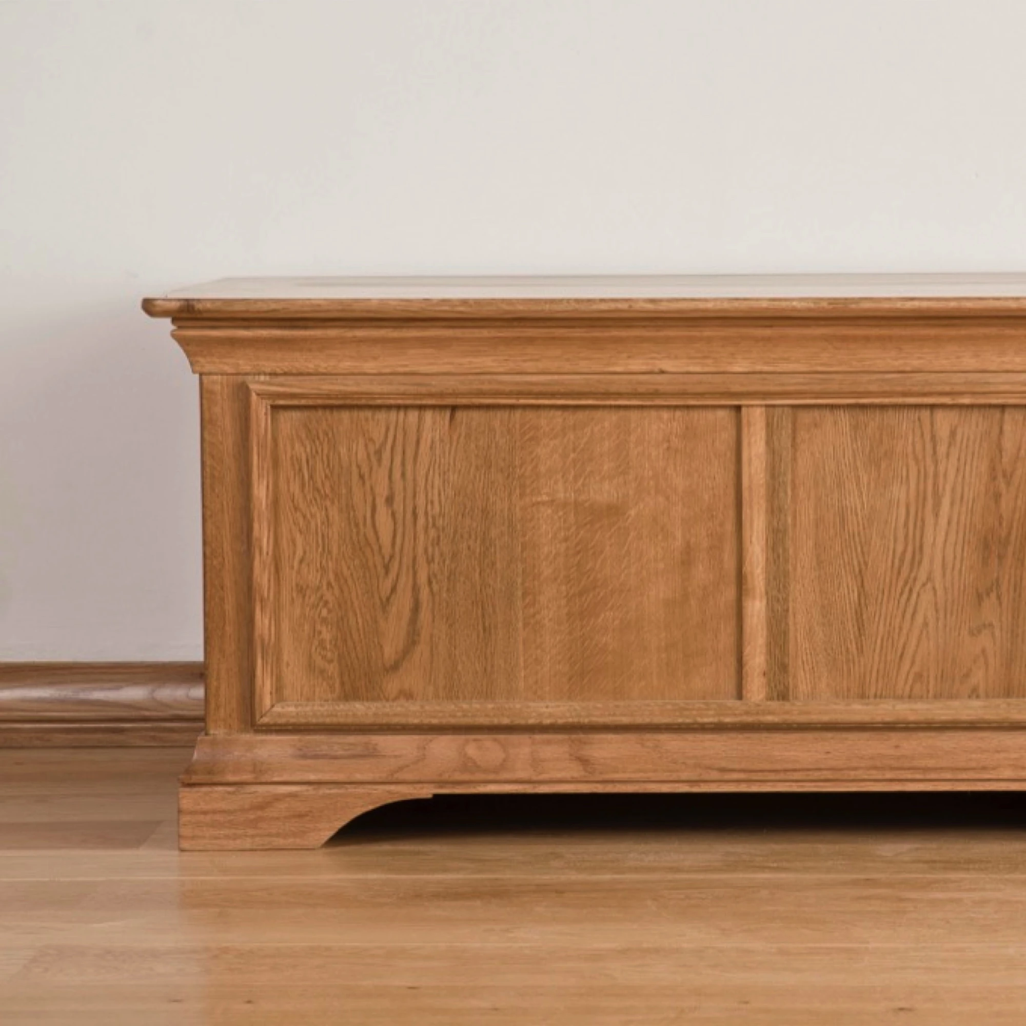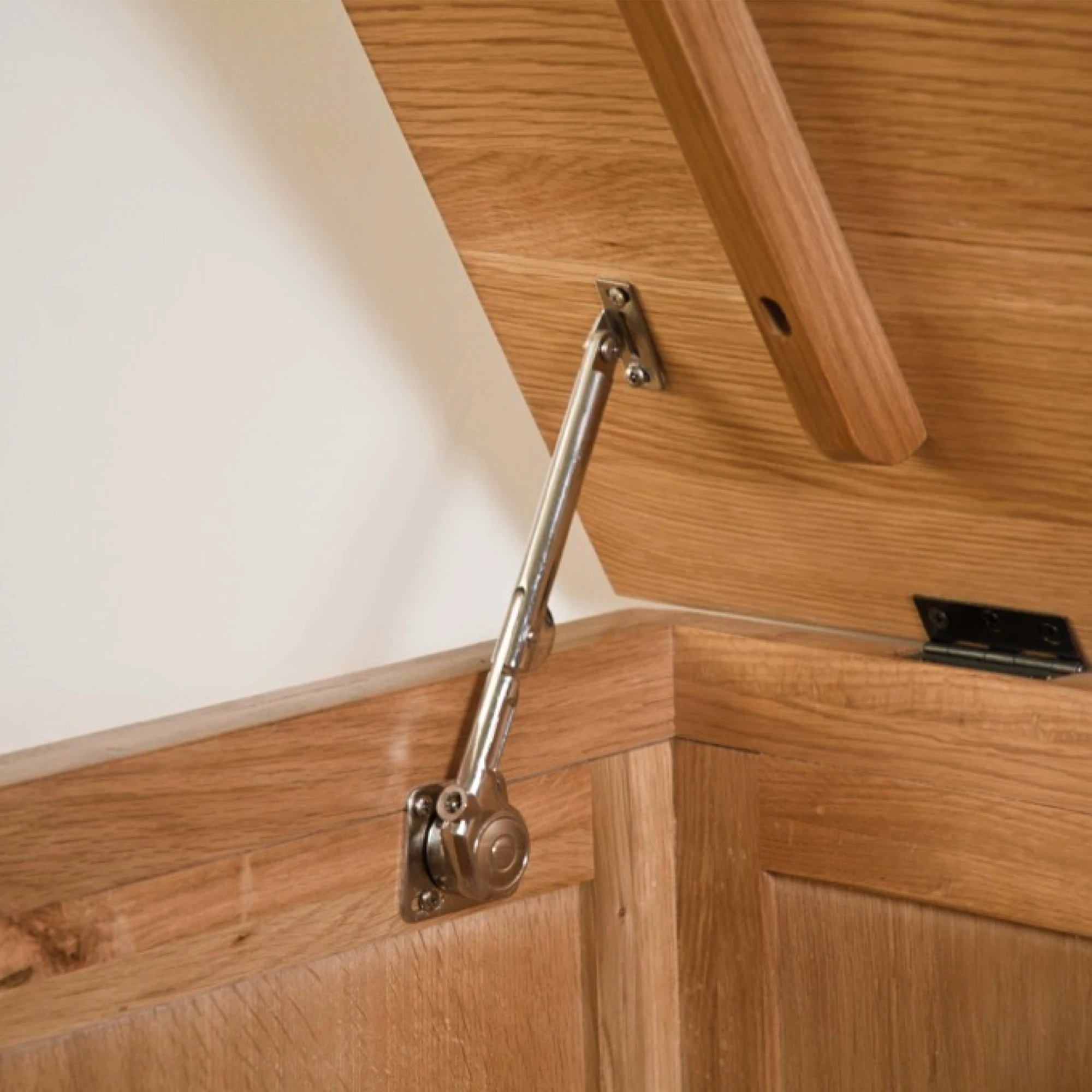 Made with solid American white Oak, this beautiful blanket box complements the Annecy bedroom set perfectly. Spacious and easy to use, the lid lifts and is secured in the upright position with smooth glide brackets which lock into place ensuring the lid doesn't close before you are ready.