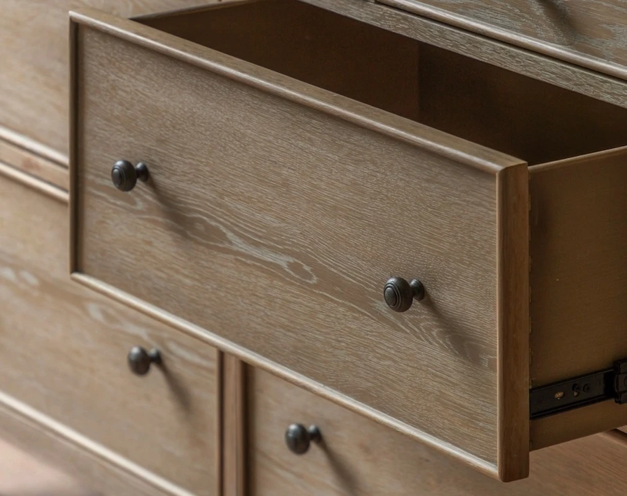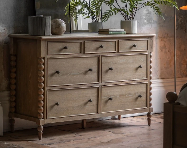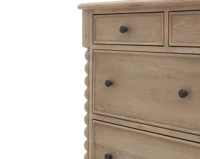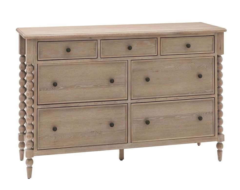 The Artisan 7 drawer chest provides a refined storage option with its timeless design and expert craftsmanship. Featuring hand-turned bobbin detailing and a lime-wash oak finish, this chest blends durability and sophistication. The three spacious drawers are ideal for organising and storing household essentials with ease.