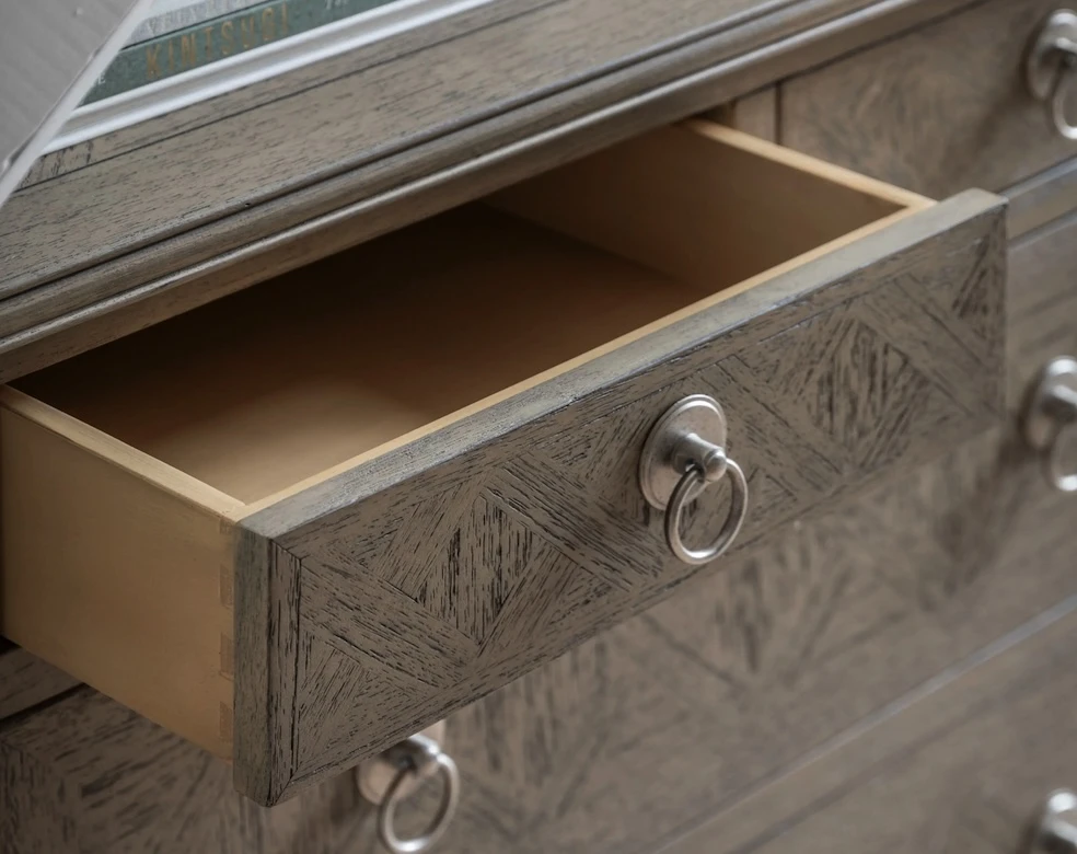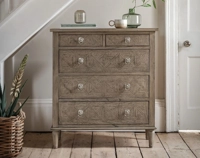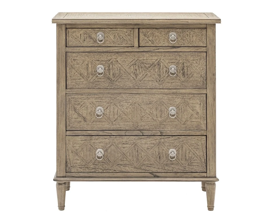 The Mustique 5 Drawer Chest is crafted using Mindy wood and lightly brushed to recreate the natural ageing of a beach side veranda, open to the elements of sun and sand. The design and finish has a nod towards French Colonial style but would equally suit a modern interior.