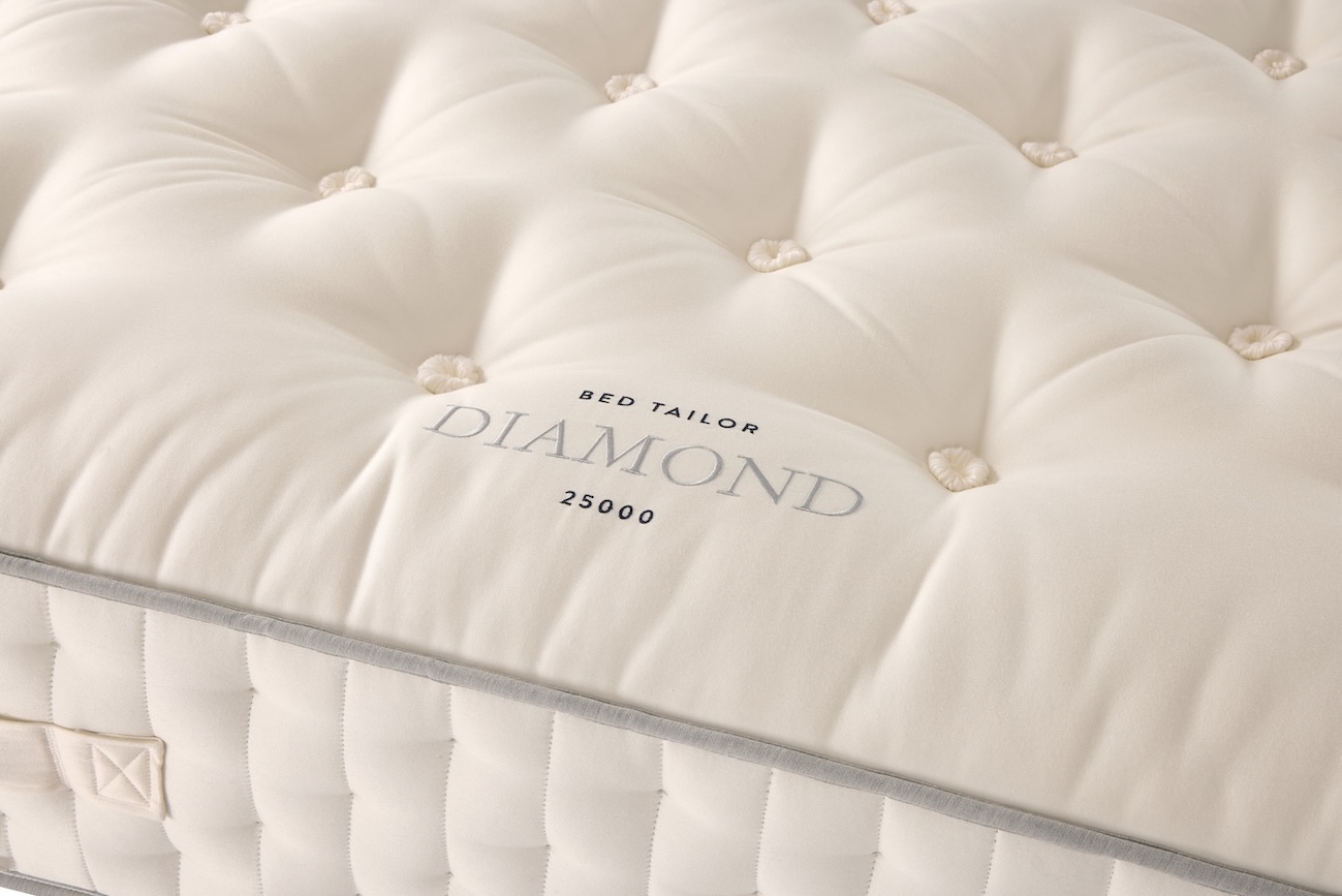 With layers of blended British wool and viscose, a British wool and mohair blend, a cashmere, Yorkshire wool, silk and British wool blend, a British wool, hemp and flax blend and a cotton, hemp and flax blend. The Diamond divan from Harrison Spinks features 25,000 award-winning springs, including Cortec™ Quad spring system and multiple layers of HD 4,000, HD 2,500 and HD 2,000 micro springs. With an in-house woven FR chemical treatment-free mattress cover and four rows of diamond side stitching, this Seasonal Turn mattress has a warming wool winter side and cooling cotton summer side.