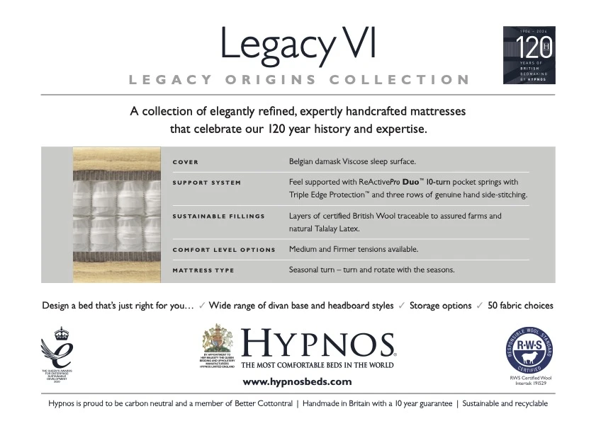 This is the best mattress on offer in the Hypnos Legacy collection, filled with fleece upon fleece of sumptuous British wool and the added luxury of breathable and hypo allergenic pressure relieving Talalay Latex too. This mattress is quite something; we love how it supports our bodies as we lay on it.