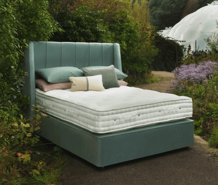 An exceptional bed with upholstered divan base and quality mattress. This is a unique mattress with plant based fruit fibres - a fabulous example of something different which can work inside a luxury mattress and be 100% sustainable too. We love natural Latex, this mattress has two deep layers of it in each side of the mattress.