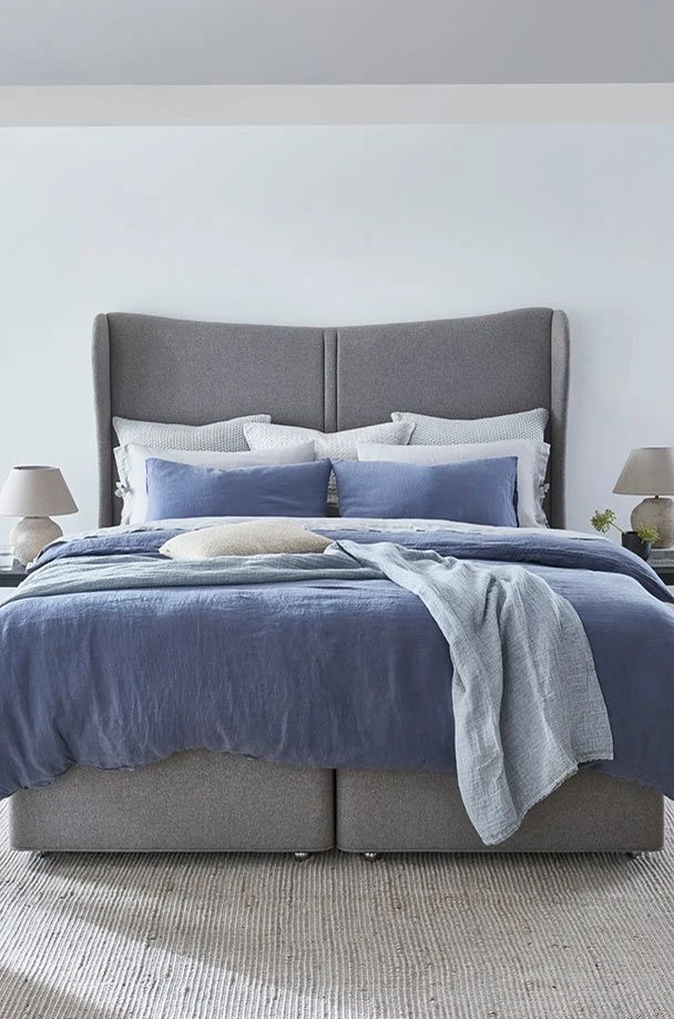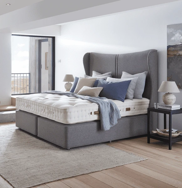 A beautiful winged headboard with a two panel design. Choose from many gorgeous fabrics to complement your decor and matching Hypnos divan set. The headboard can be attached to all divan bases with bolts and stands firmly on the floor with a statement height finish.