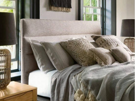 Josephine is a deep upholstered modern headboard design with three luxurious looking horizontal panels. The height is generous and the pleats neatly drawn into the backboard. There is a neat piped finish along the border that sets this design off nicely.