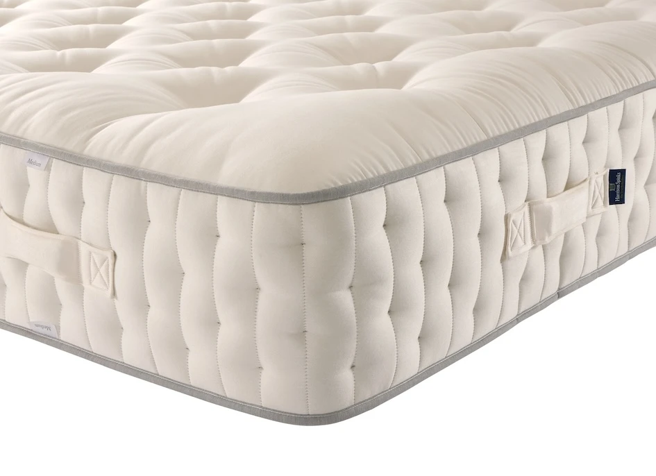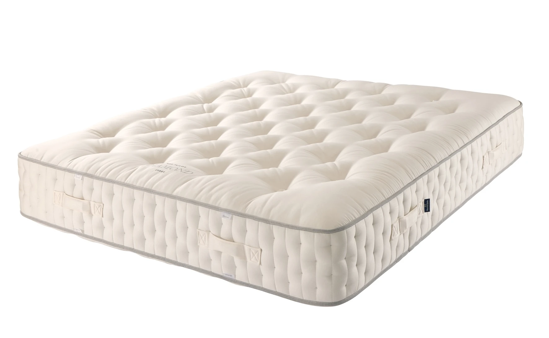 The Diamond 25000 Mattress by Harrison Spinks layers natural fibres for comfort: a British wool & viscose blend; a British wool & mohair blend; a cashmere, Yorkshire wool, silk & British wool blend; a British wool, hemp & flax blend; and a cotton, hemp & flax blend. It contains 25,000 award-winning springs, featuring the Cortec™ Quad spring system plus multiple layers of HD 4,000, HD 2,500 and HD 2,000 micro springs. Finished with an in-house-woven, FR chemical-treatment-free cover and four rows of diamond side stitching. This Seasonal Turn design provides a warming wool winter side and a cooling cotton summer side.