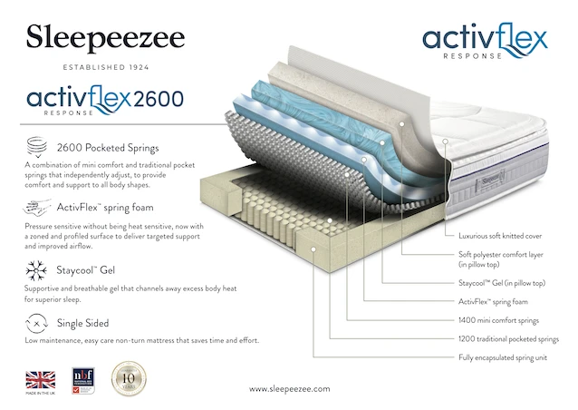 The Sleepeezee ActiveFlex Response 2600 Divan Set has much to offer with unique ActiveFlex spring foam, staycool gel and an extra layer of mini pocket springs. With all of these high quality materials this carefully crafted mattress will shape to the contours of your body ensuring you get optimal support and pressure relief.