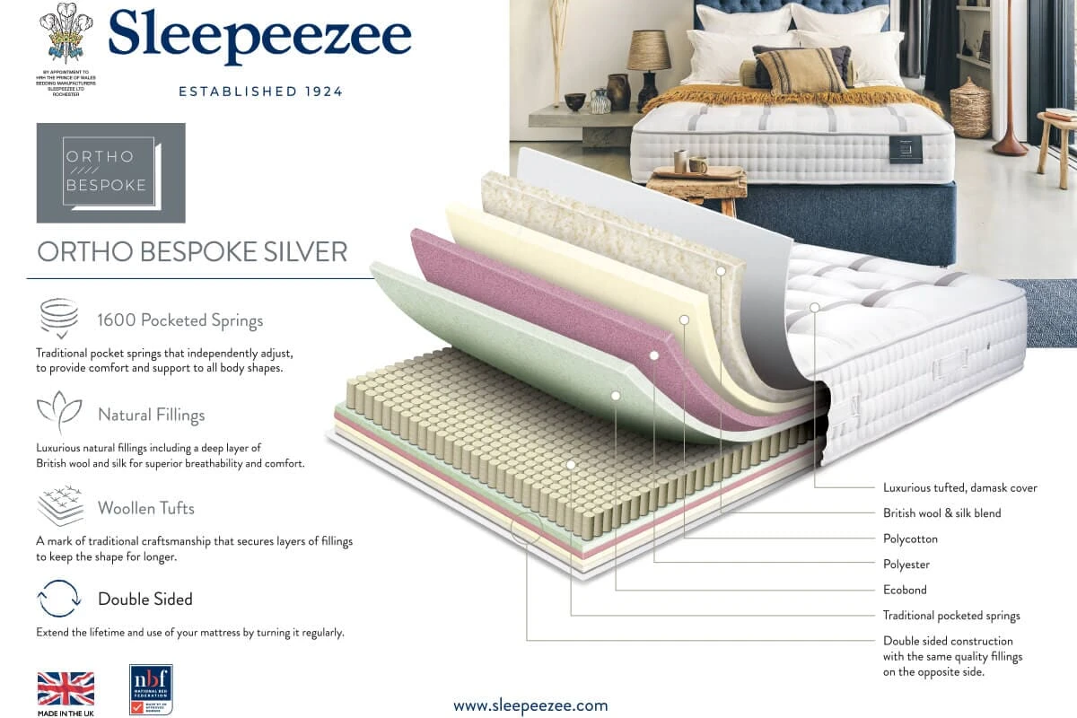 Choose Sleepeezee Ortho Silver 1600 mattress for firmer support. Its filled with 1600 pocket springs and extra deep layers of 100% British lambswool and silk for a breathable sleep surface - ideal for keeping your body temperature regulated as you sleep in all seasons and it's expertly made in Britain by Sleepeezee trained craftsmen.