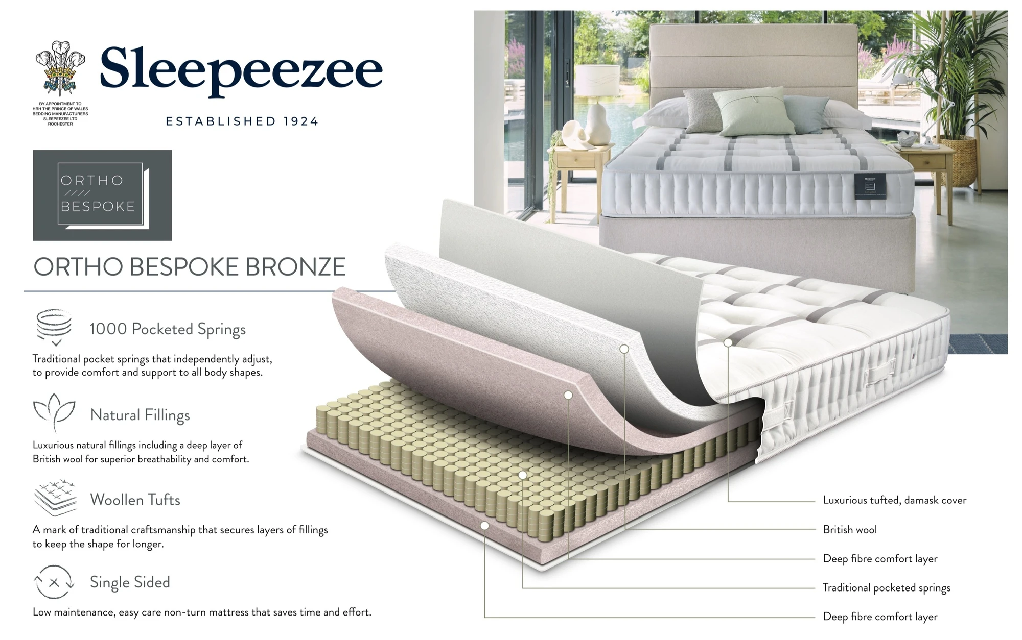 Choose Sleepeezee Ortho Bronze 1000 mattress for firmer support. Its filled with 1000 pocket springs and extra deep layers of 100% British lambswool for a breathable sleep surface - ideal for keeping your body temperature regulated as you sleep in all seasons and it's expertly made in Britain by Sleepeezee trained craftsmen.