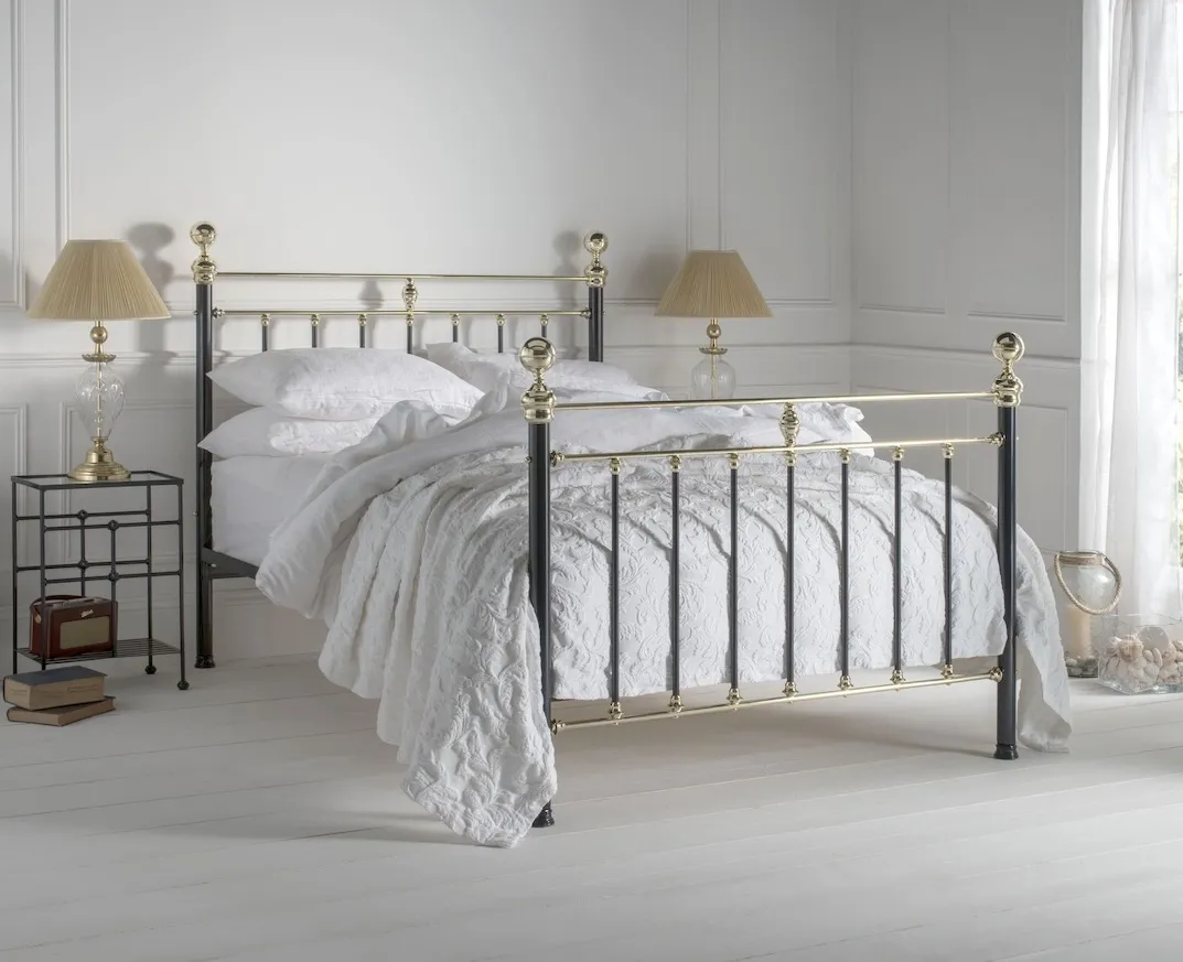 The Frederick wrought iron and brass bedstead offers a classic design with an extra touch of opulence. It features grand bedposts, chunky hand spun finials and extra brass detail. This bedstead is made to last a lifetime, comes in many beautiful colours and has three types of bed base from slatted to luxury upholstered sprung divans for the ultimate support for your mattress to rest.