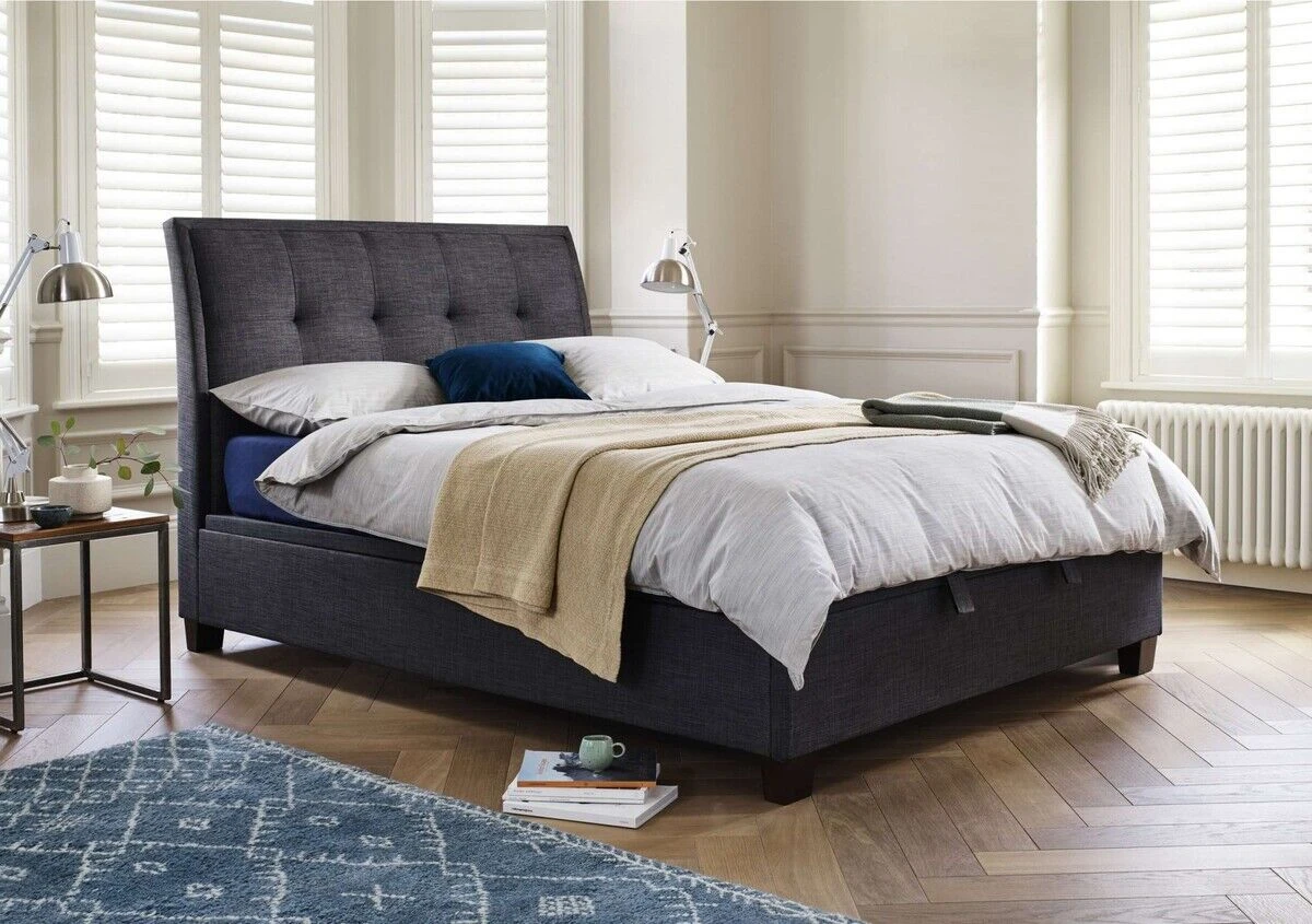 This bed features a stylish curved headboard, hardwood feet and comes in a choice of luxury fabrics which will suit any decor. The frame space is maximised by the solid top boards and extra sturdy support arms. Delivery is usually in stock and can be dispatched within days. It's flat pack, and can be assembled within about 1 hour.