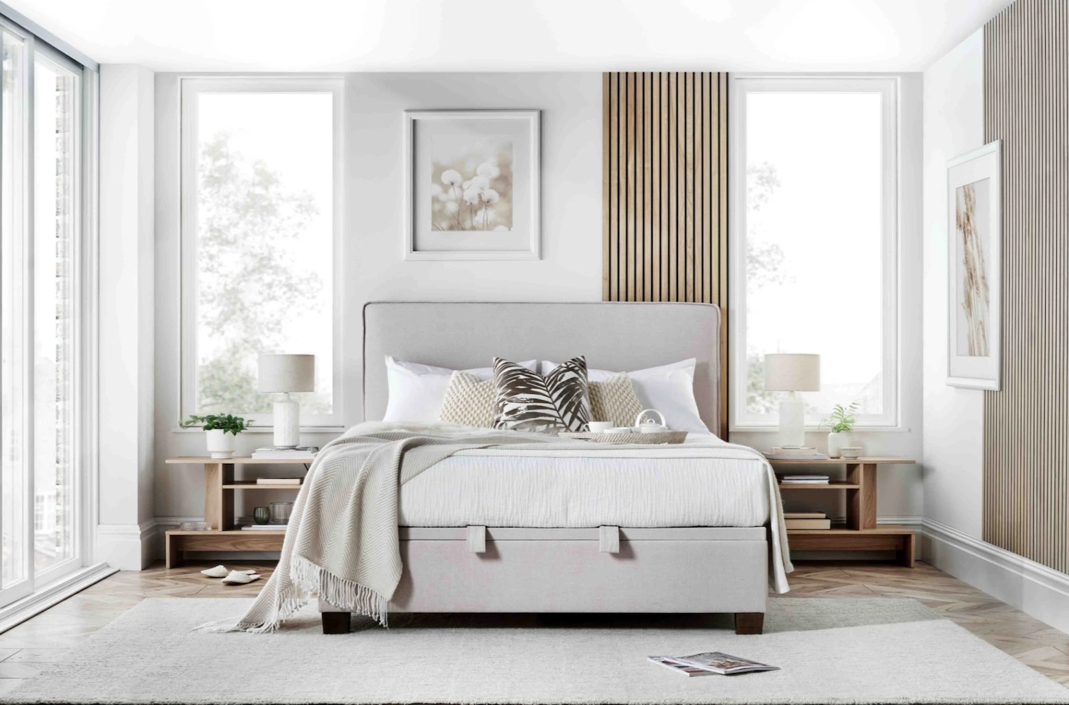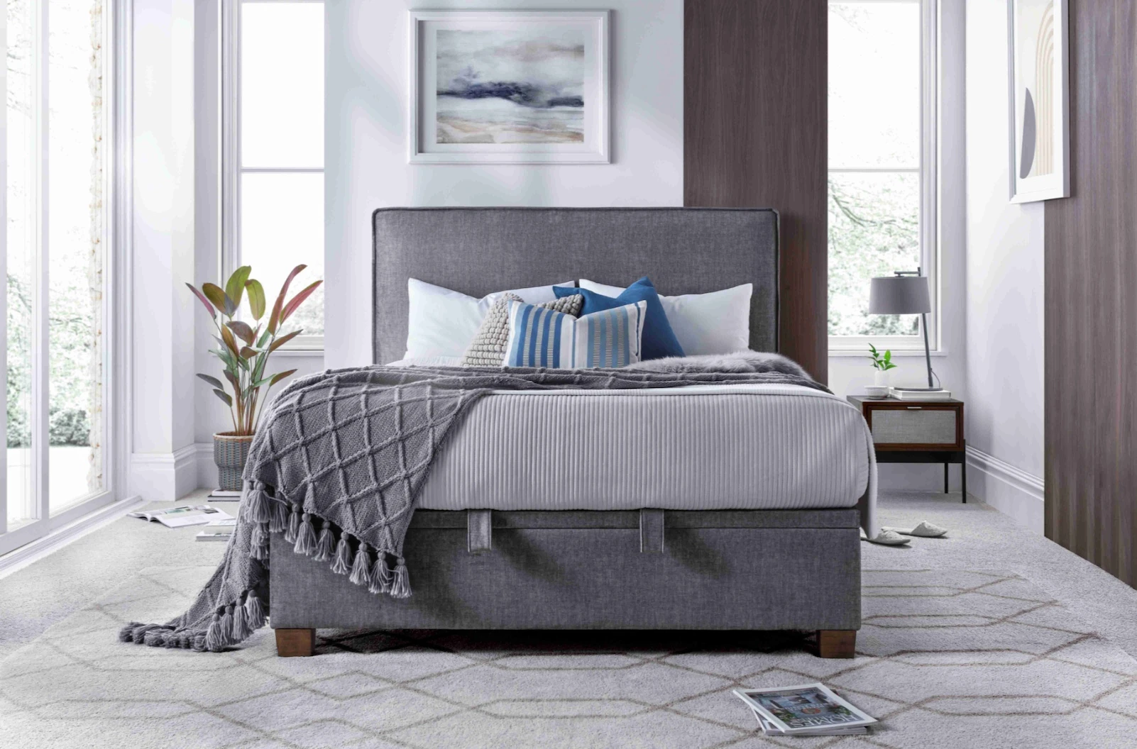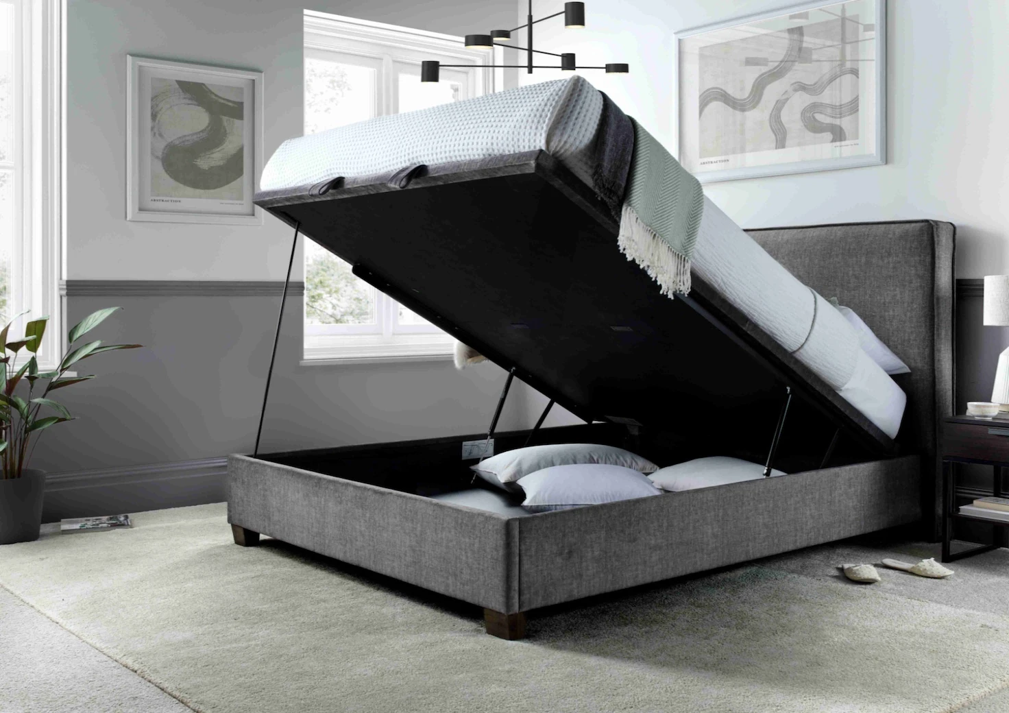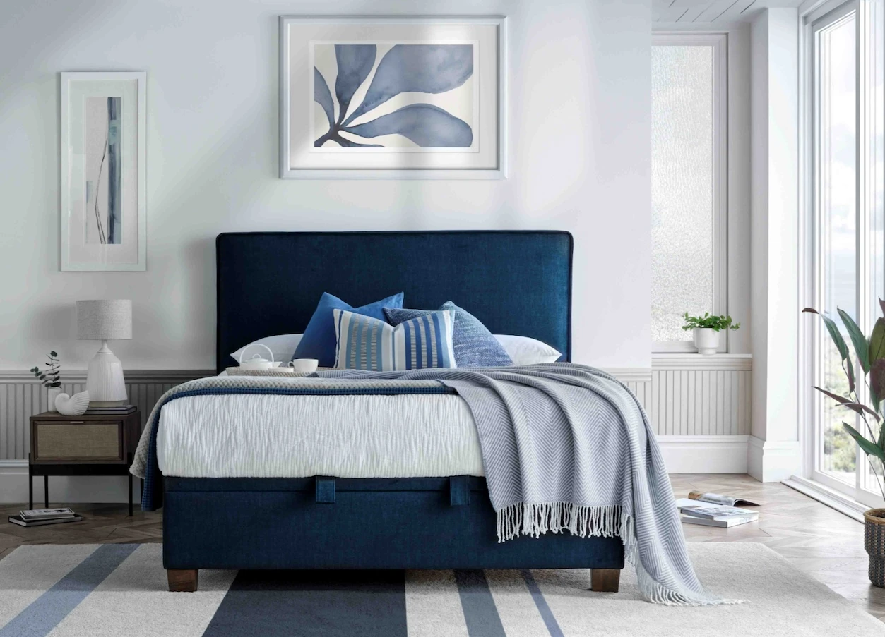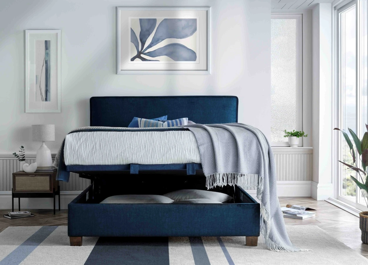 This bed has a beautiful designer piped headboard and fantastic storage ottoman with an easy lift lid and safety bar underneath