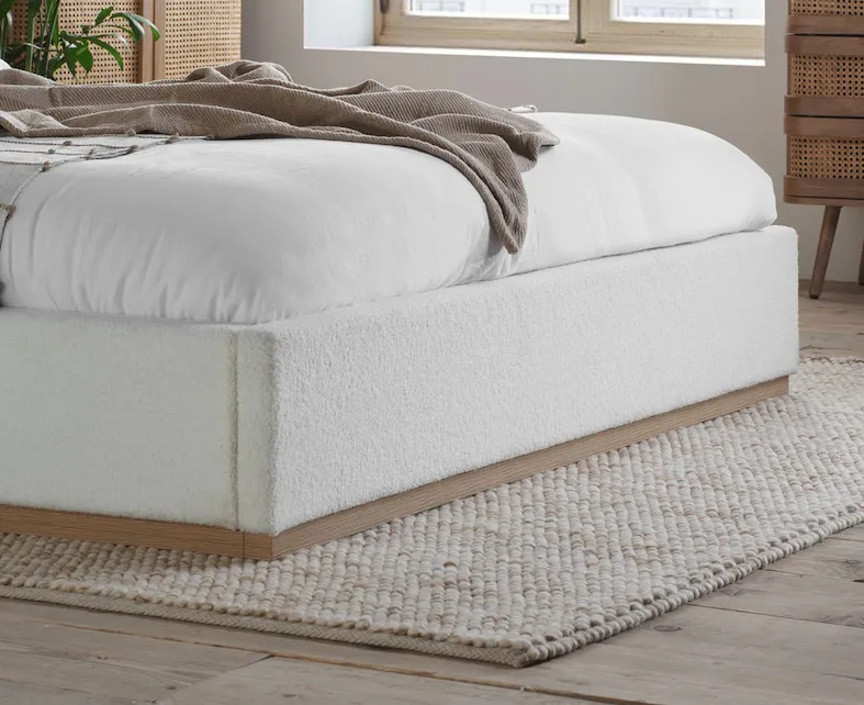 The Matera Bed combines timeless elegance with luxurious comfort. Upholstered in soft, textured bouclé, its generously curved headboard offers plush support for reading or relaxing. Built with a sturdy frame for lasting durability, the Matera creates a serene, stylish focal point in any bedroom, perfect for a restful retreat or guest space.