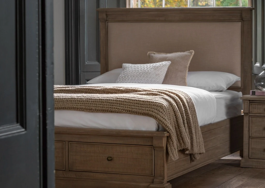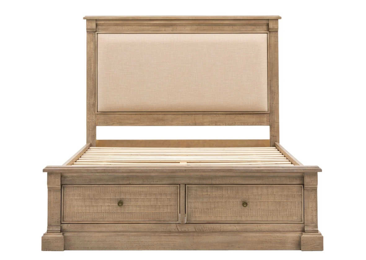 The Vancouver bed frame is a stylish and functional addition to any bedroom. Its weathered wood frame exudes a timeless charm, while the upholstered headboard provides a touch of luxury and comfort. The built-in storage drawers offer ample space for bedding, clothes, or other items, making it a practical choice for smaller spaces. This bed is perfect for those who appreciate a blend of rustic style and modern convenience.