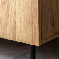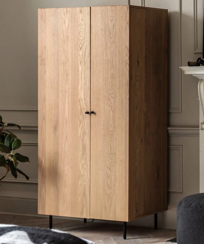 Add a contemporary look to a bedroom with the Ashdown wardrobe. It is crafted using oak veneers paired with a black metal underframe and door handles. The natural wood veneer, with its unique random knots, has been selected to give a modern rustic style. Matching pieces available.