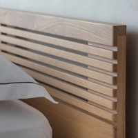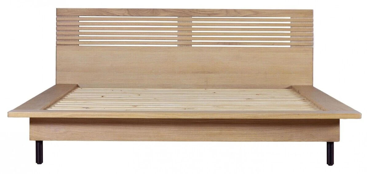 Okayama is a stunning Japandi-style wooden bed frame, featuring a section of solid oak slats on the headboard with radius detailing running up the edges to give a high-quality finish. Slim black metal legs at the foot end complete the look.