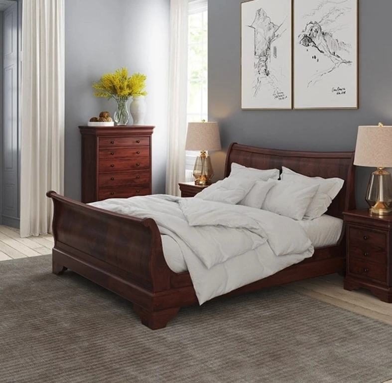 The Antoinette bed frame from Willis & Gambier is part of a beautiful bedroom collection inspired by classic French design. Featuring elegant carved detailing on both the headboard and footboard and a graceful curve that sweeps from side to side, complemented by a gently scrolled, swept-back headboard. This timeless piece brings sophistication and charm to any bedroom setting.
