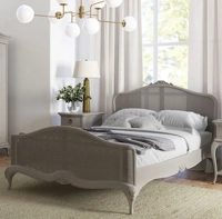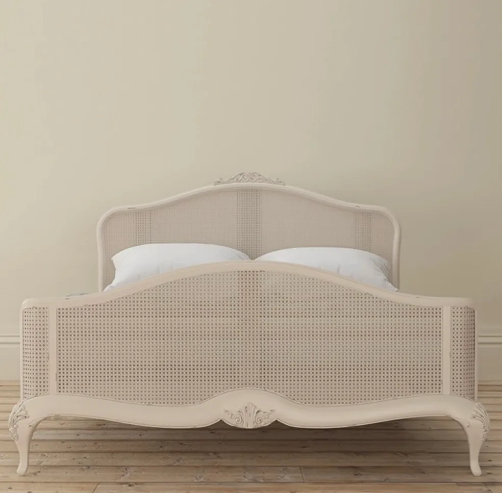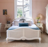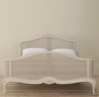 The Willis & Gambier Ivory Rattan Bed Frame is available in three sizes and features a charming cream finish. Inspired by classic French design, it showcases delicate carved detailing on both the headboard and footboard, complemented by gracefully shaped legs for a timeless, elegant look.